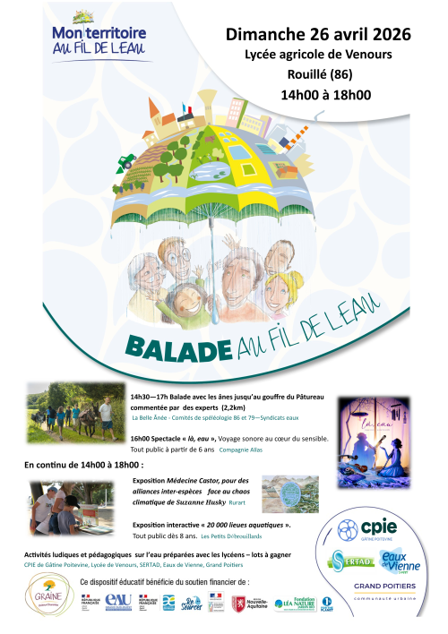 Dans le cadre du dispositif Mon Territoire au Fil de l’Eau* coordonné par le GRAINE Poitou-Charentes, le CPIE de Gâtine Poitevine et le SERTAD, proposent dimanche 26 avril une Balade au Fil de l’Eau, au coeur du Lycée agricole de Venours, avec la contribution des ses élèves !💧