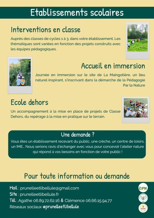 Prunelle et Libellule propose également des prestations en établissement scolaire avec des interventions en classe, des accueils en immersion sur le site de La Maingotière ou encore l’accompagnement à la mise en place de projets de Classe Dehors !